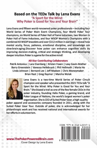 Across her numerous poker endeavors-player, CEO, speaker, advocate-Lena Evans embodies the idea that poker is a game of skill and a platform for mental development, personal growth, and empowerment. She is a two-time World Series of Poker Circuit champion and speaker whose 2021 TEDx talk, "A Sport for the Mind: Why Poker is Good for You and Your Brain," is the foundation for this book.In her TEDx talk, Lena made a compelling case for poker as more than just a game of chance-it is a rigorous mental sport that builds cognitive strength, emotional discipline, and strategic thinking. Thanks to the TEDx talk, her message reached a global audience and sparked meaningful conversations about the brain benefits of poker.Lena has broken barriers as one of the few female CEOs in the poker industry. She is the founder of Helix Poker, an innovative gaming brand, and Poker League of Nations (PLON), the world's largest women's poker organization, committed to empowering and increasing the number of women in the game. Through PLON, Lena has cultivated a thriving community that promotes inclusion, education, and opportunity for female players worldwide. In addition, she leads Suited Poker Gear, a high-quality poker apparel and accessories company founded in 2011, along with the Suited Poker Gear Tour, further demonstrating her entrepreneurial vision and commitment to growing the game in creative, engaging ways.Lena's tournament accomplishments speak for themselves. She was the first woman to win two World Series of Poker Circuit championship rings in one season (2017-2018). Her poker résumé is stacked with victories across major events. As a trailblazing force in the poker world, her contributions to the game continue inspiring players to pursue excellence at the table while caring for their minds beyond it.