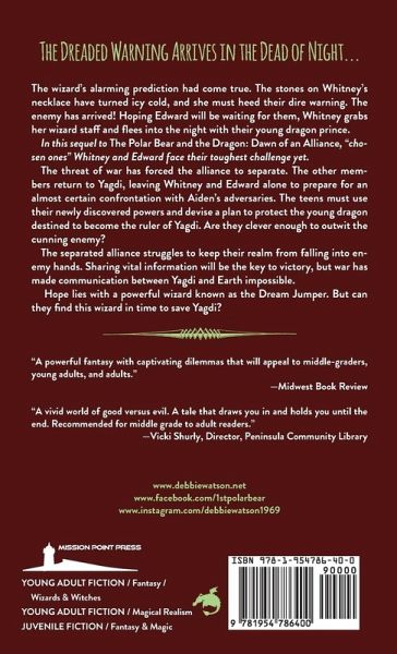 The Dreaded Warning Arrives in the Dead of Night... The wizard's alarming prediction had come true. The stones on Whitney's necklace have turned icy cold, and she must heed their dire warning. The enemy has arrived! Hoping Edward will be waiting for them, Whitney grabs her wizard staff and flees into the night with their young dragon prince. In this sequel to The Polar Bear and the Dragon: Dawn of an Alliance, "chosen ones" Whitney and Edward face their toughest challenge yet. The threat of war has forced the alliance to separate. The other members return to Yagdi, leaving Whitney and Edward alone to prepare for an almost certain confrontation with Aiden's adversaries. The teens must use their newly discovered powers and devise a plan to protect the young dragon destined to become the ruler of Yagdi. Are they clever enough to outwit the cunning enemy? The separated alliance struggles to keep their realm from falling into enemy hands. Sharing vital information will be the key to victory, but war has made communication between Yagdi and Earth impossible. Hope lies with a powerful wizard known as the Dream Jumper. But can they find this wizard in time to save Yagdi? Fans of "The Last Dragon Chronicles, "The Chronicles of Narnia," and "A Wrinkle in Time" will love "The Polar Bear and the Dragon series." This is Book 2 in a coming-of-age fantasy adventure series for ages 10 and up. Click Read Sample to begin Chapter 1 today.