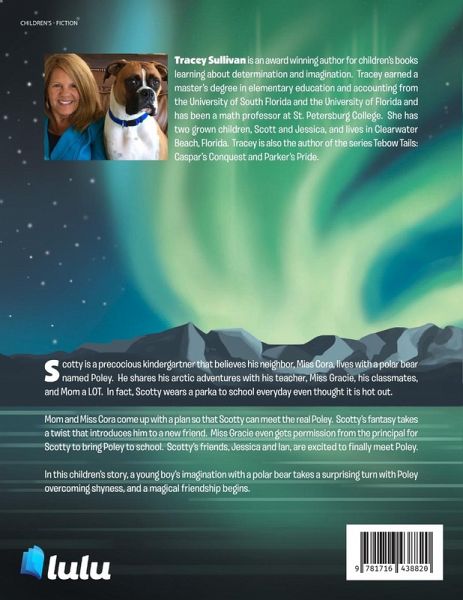 Scotty is a precocious kindergartner that believes his neighbor, Miss Cora, lives with a polar bear named Poley. He shares his arctic adventures with his teacher, Miss Gracie, his classmates, and Mom a LOT. In fact, Scotty wears a parka to school everyday even though it is hot out. Mom and Miss Cora come up with a plan so that Scotty can meet the real Poley. Scotty's fantasy takes a twist that introduces him to a new friend. Miss Gracie even gets permission from the principal for Scotty to bring Poley to school. Scotty's friends, Jessica and Ian, are excited to finally meet Poley. In this children's story, a young boy's imagination with a polar bear takes a surprising turn with Poley overcoming shyness, and a magical friendship begins.