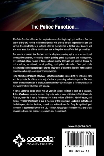 The Police Function addresses the complex issues confronting today's police officers. Over the course of the text, readers will become familiar with officers' official responsibilities and the various dynamics that have a profound effect on their abilities to do their jobs. Students will also learn about how officers function and how active police work affects their personalities. The book is organized into fourteen concise chapters covering topics such as patrol and investigative functions, community-oriented policing, police organization and management, organizational ethics, the use of force, and civil liability. There are also chapters devoted to police culture, recruitment, racial profiling, and police misconduct. Two particularly high-interest and unexpected topics are the importance of discretion in police work and how environmental design can support crime prevention. High-interest and engaging, The Police Function gives readers valuable insight into police work and the potential for officers to be truly effective in preventing and reducing crime. The book will be a welcome addition to any course in introductory administration of justice or classes in programs for officer education and training. A former California police officer with 29 years of service, fourteen of them as a sergeant, Arthur Wiechmann earned a master's degree in social science at California State University Fullerton, where he is now a faculty member in the Division of Politics, Administration, and Justice. Professor Wiechmann is also a graduate of the Supervisory Leadership Institute and the Delinquency Control Institute, as well as a nationally certified Drug Recognition Expert Instructor. In addition to his work with CSU Fullerton, he teaches at Fullerton College and writes on community-oriented policing, supervision, and management.