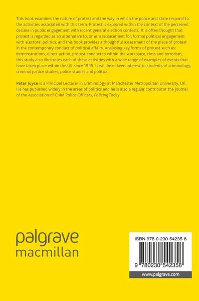 This book examines the nature of protest and the way in which the police and state respond to the activities associated with this term. Protest is explored within the context of the perceived decline in public engagement with recent general election contests. It is often thought that protest is regarded as an alternative to, or as a replacement for, formal political engagement with electoral politics, and this book provides a thoughtful assessment of the place of protest in the contemporary conduct of political affairs. Analysing key forms of protest such as: demonstrations, direct action, protest conducted within the workplace, riots and terrorism, this study also illustrates each of these activities with a wide range of examples of events that have taken place within the UK since 1945. It will be of keen interest to students of criminology, criminal justice studies, police studies and politics.