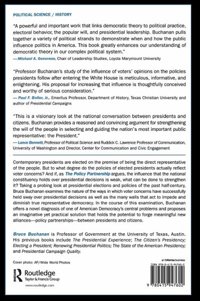 The presidency was neither designed nor expected to act in concert with the American people; the Framers intended Congress to represent the popular will. Thanks in part to public outrage at Congressional abuses of power, Thomas Jefferson and Andrew Jackson led mass movements that forced major changes in the presidency, electoral politics, and national policy. Contemporary presidents are elected on the promise of being the direct representative of the people. There is an implicit deal between the president and voters: election to office in return for responsiveness to voter concerns. As The Policy Partnership shows, this relationship has been crumbling for some time. Presidents frequently break campaign promises and make unpopular decisions, while the public rarely bands together to demand attention to policy concerns. Many people simply do not vote; political elites take advantage of this indifference to advance their own agendas. Bruce Buchanan explores the presidential elections of the last half-century to answer pressing questions created by this situation: What has become of the policy relationship potential created by presidential elections? To what degree do candidates and presidents take voter policy concerns into account before and after elections? How much influence do voters really have on presidential policy? What can be done to increase voter participation and presidential responsiveness? The central question of democratic politics comes down to the relationship between popular electoral choices and public policy: if voters can't influence what government does, then what is the point of democracy?
