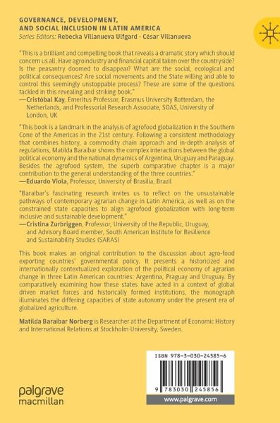 This book makes an original contribution to the discussion about agro-food exporting countries' governmental policy. It presents a historicized and internationally contextualized exploration of the political economy of agrarian change in three Latin American countries: Argentina, Praguay, and Uruguay. By comparatively examining how these states have acted in a context of global driven market forces and historically formed institutions, the monograph illuminates the differing capacities of state autonomy under the present era of globalized agriculture.