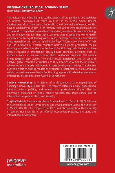 This edited volume highlights cascading effects of the pandemic and lockdown on informal economies of varied countries in the Global South. Uneven development after colonization, imperialism, and externally influenced conflict have caused many countries in the formally colonized or semi-occupied countries in the world to lag behind in wealth accumulation, investments in manufacturing, and technology. The fact that these countries were dragged into world market dynamics on an equal footing with already developed countries exacerbated these inequalities and saw the rapid burgeoning of informal economies. COVID-19 and the lockdown of western countries unravelled global production chains, resulting in hordes of workers in the Global South losing their livelihoods. Even people engaged in traditionally locally-bound economic activities, such as domestic work and sex work, found their livelihoods disappear. This volume brings together case studies from India, Brazil, Bangladesh, and Sri Lanka to analyze global economic disruptions as they affected informal sector workers who were already largely invisible within state development policies. The chapters question whether existing models of neoliberal development are still conducive within the post-pandemic Global South as it grapples with rebuilding economies, livelihoods, institutions, and systems of governance.