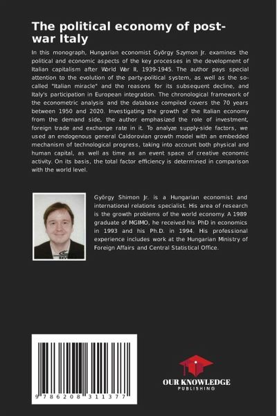 In this monograph, Hungarian economist György Szymon Jr. examines the political and economic aspects of the key processes in the development of Italian capitalism after World War II, 1939-1945. The author pays special attention to the evolution of the party-political system, as well as the so-called "Italian miracle" and the reasons for its subsequent decline, and Italy's participation in European integration. The chronological framework of the econometric analysis and the database compiled covers the 70 years between 1950 and 2020. Investigating the growth of the Italian economy from the demand side, the author emphasized the role of investment, foreign trade and exchange rate in it. To analyze supply-side factors, we used an endogenous general Caldorovian growth model with an embedded mechanism of technological progress, taking into account both physical and human capital, as well as time as an event space of creative economic activity. On its basis, the total factor efficiencyis determined in comparison with the world level.