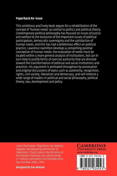 This ambitious and lively book argues for a rehabilitation of the concept of 'human needs' as central to politics and political theory. Contemporary political philosophy has focused on issues of justice and welfare to the exclusion of the important issues of political participation, democratic sovereignty, and the satisfaction of human needs, and this has had a deleterious effect on political practice. Lawrence Hamilton develops a compelling positive conception of human needs: the evaluation of needs must be located within a more general analysis of institutions, but can in turn help to justify forms of coercive authority that are directed toward the transformation of political and social institutions and practices. His argument is animated throughout by provocative and original discussions of topics such as autonomy, recognition, rights, civil society, liberalism and democracy, and will interest a wide range of readers in political and social philosophy, political theory, law, development and policy.