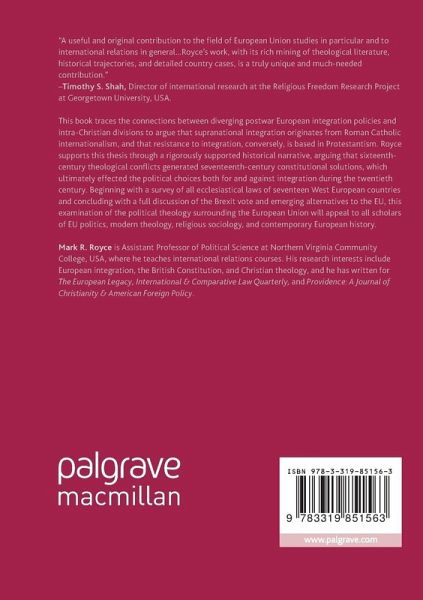 This book traces the connections between diverging postwar European integration policies and intra-Christian divisions to argue that supranational integration originates from Roman Catholic internationalism, and that resistance to integration, conversely, is based in Protestantism. Royce supports this thesis through a rigorously supported historical narrative, arguing that sixteenth-century theological conflicts generated seventeenth-century constitutional solutions, which ultimately effected the political choices both for and against integration during the twentieth century. Beginning with a survey of all ecclesiastical laws of seventeen West European countries and concluding with a full discussion of the Brexit vote and emerging alternatives to the EU, this examination of the political theology surrounding the European Union will appeal to all scholars of EU politics, modern theology, religious sociology, and contemporary European history.