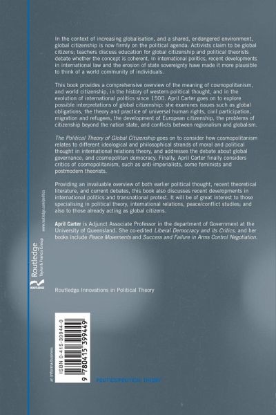This book provides a comprehensive overview of the meaning of cosmopolitanism and world citizenship in the history of Western political thought, and in the evolution of international politics since 1500. Providing an invaluable overview of earlier political thought, recent theoretical literature and current debates, this book also discusses recent developments in international politics and transnational protest. It will be of great interest to those specialising in political theory, International Relations and peace/conflict studies. It will also interest those already acting as global citizens.