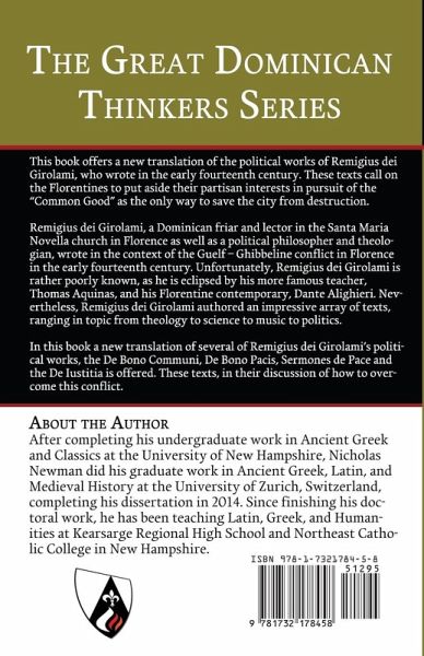 Remigius dei Girolami, a Dominican friar and lector in the Santa Maria Novella church in Florence as well as a political philosopher and theologian, wrote in the context of the Guelf – Ghibbeline conflict in Florence in the early fourteenth century. Unfortunately, Remigius dei Girolami is rather poorly known, as he is eclipsed by his more famous teacher, Thomas Aquinas, and his Florentine contemporary, Dante. Nevertheless, Remigius dei Girolami authored an impressive array of texts, ranging in topic from theology to science to music to politics. In this book a new translation of several of Remigius dei Girolami’s political works, the De Bono Communi, De Bono Pacis, Sermones de Pace and the De Iustitia is offered. These texts, in their discussion of how to overcome this conflict, offer a unique perspective, since Remigius dei Girolami carefully avoids the core of the conflict, the last playing out of the Investiture controversy between Pope and Emperor, and instead focuses on the relationship between the individual and the state. These are not polemic texts, meant to bolster one side over the other, rather he paints a picture in which even the victory of one side over the other results in destruction for all, since conflict is of detriment to society as a whole. It is not imperial party or papal party that are the problem and must be defeated, as is seen often in other texts of the same time period, such as the Defensor Pacis by Marsilius of Padua or Dante’s De Monarchia, whose hatred of the Black Guelfs was so great that he consigned many of their leaders in the Inferno. Instead, it is the individual who does not love the city who is culpable for the destruction of the state, conversely, it is through the love of this individual for the community that all benefit. In addition to the translation, the book offers contextualization and structural analysis in a general introduction as well as introductions to each text. Much of the discussion centers on the influence of Thomas Aquinas, felt everywhere in Remigius dei Girolami’s works, from the setup of the section of objections to the adoption of the Thomistic understanding of the relationship of human and divine law to the pervasive reliance on Aristotle. Especially in the De Bono Communi and De Bono Pacis quotations of and references to the works of Aristotle are made as often as Scriptural references. It is this reliance on Aristotle that allows Remigius dei Girolami to formulate his argument. Remigius dei Girolami adopts the Aristotelian principle of the part and the whole in his understanding of the relationship of the individual to the community. Using the image of a hand or foot as part of the body, beyond which the hand or foot has no real existence, Remigius adapts this to argue that the citizen has no real existence beyond the community. If this is the case, then anything which endangers the community, such as the constant fighting between political factions, is an existential threat to each individual part of the community, even the part which is victorious.