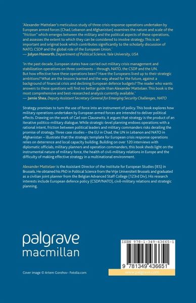 'Alexander Mattelaer's meticulous study of three crisis response operations undertaken by European armed forces (Chad, Lebanon and Afghanistan) examines the nature and scale of the 'friction' which emerges between the military and the political aspects of these operations, and assesses the extent to which they can be considered to involve strategy. This is an important and original book which contributes significantly to the scholarly discussion of NATO, CSDP and the global role of the European Union.' - Jolyon Howorth, Department of Political Science, Yale University, USA.