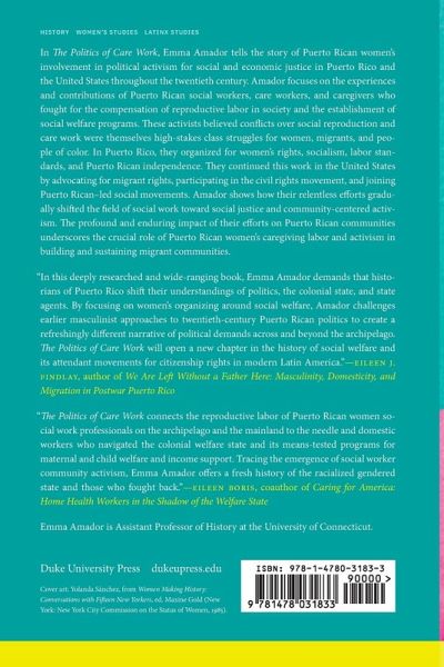In The Politics of Care Work, Emma Amador tells the story of Puerto Rican women's involvement in political activism for social and economic justice in Puerto Rico and the United States throughout the twentieth century. Amador focuses on the experiences and contributions of Puerto Rican social workers, care workers, and caregivers who fought for the compensation of reproductive labor in society and the establishment of social welfare programs. These activists believed conflicts over social reproduction and care work were themselves high-stakes class struggles for women, migrants, and people of color. In Puerto Rico, they organized for women's rights, socialism, labor standards, and Puerto Rican independence. They continued this work in the United States by advocating for migrant rights, participating in the civil rights movement, and joining Puerto Rican-led social movements. Amador shows how their relentless efforts gradually shifted the field of social work toward social justice and community-centered activism. The profound and enduring impact of their efforts on Puerto Rican communities underscores the crucial role of Puerto Rican women's caregiving labor and activism in building and sustaining migrant communities.