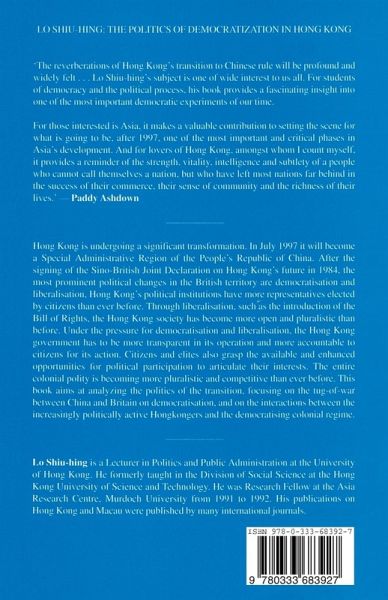 An analysis of the politics of transition in Hong Kong, focusing on the tug-of-war between China and Britain on democratization, and on the interactions between the increasingly politically active people of Hong Kong and the democratizing colonial regime. The successes and failures of British policy since 1984, and the missed opportunities to democratize faster prior to Governor Patten's appointment in 1992 are examined.