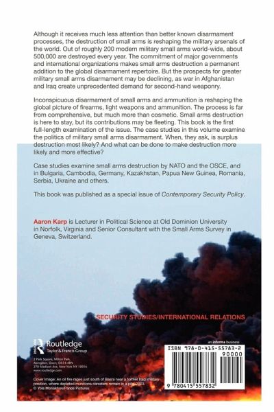 Although it receives much less attention than better known disarmament processes, the destruction of small arms is reshaping the military arsenals of the world. Out of roughly 200 modern military small arms world-wide, about 500,000 are destroyed every year. The commitment of major governments and international organizations makes small arms destruction is a permanent addition to the global disarmament repertoire. But the prospects for greater military small arms disarmament may be declining, as war in Afghanistan and Iraq create unprecedented demand for second-hand weaponry. Inconspicuous disarmament of small arms and ammunition is reshaping the global picture of firearms, light weapons and ammunition. The process is far from comprehensive, but much more than cosmetic. Small arms destruction is here to stay, but its contributions may be fleeting. This book is the first full-length examination of the issue. The case studies in this volume examine the politics of military small arms disarmament. When, they ask, is surplus destruction most likely? And what can be done to make destruction more likely and more effective? Case studies examine small arms destruction by NATO and the OSCE, and in Bulgaria, Cambodia, Germany, Kazakhstan, Papua New Guinea, Romania, Serbia, Ukraine and others. This book was published as a special issue of Contemporary Security Policy.