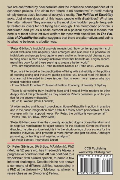 We are confronted by neoliberalism and the inhumane consequences of its economic policies. The claim that "there is no alternative" to profit-making simply denies basic features of everyday reality. The Politics of Disability asks: Just where does all of this leave people with disabilities? What are their alternatives? They are among the most downtrodden people, frequently treated as losers for not trying hard enough. This meritocratic principle is antiquated and yet as a basic element of a political system it means that here is at most a little left-over welfare for those with disabilities. In The Politics of Disability the author suggests that there are alternatives and points to what he believes is a better way. Reviews: "Peter Gibilisco's insightful analysis reveals both how contemporary forms of social exclusion and inequality have emerged, and also how it is possible for individuals and groups to struggle to seek and to achieve social change so as to bring about a more socially inclusive world that benefits all. I highly recommend this book for all those seeking to create a better world." - Prof. Tim Marjoribanks, La Trobe Business School, La Trobe Univ., Victoria, AU "If you are interested in the practicalities of living with a disability or the politics of creating caring and inclusive public policies, you should read this book. If you are not interested in these issues, that is even more reason why you should read this book!" - Frank Stilwell, Emeritus Professor of Political Economy, University of Sydney "There is something truly inspiring here and I would invite readers to think deeply about this problematic as they consider Peter's persistent push for justice for the severely disabled." - Bruce C. Wearne (Point Lonsdale) "A wide ranging and thought provoking critique of disability in policy, in practice and in the public imagination, from a vital but rarely heard perspective of a service user with high support needs. For Peter, the political is very personal." - Penny Paul, BA, BSW, MPP (Melb) "Peter Gibilisco examines the currently accepted dogma of neoliberalism and its negative ramifications for a just society for the disabled. Given that Peter is disabled, he offers unique insights into the shortcomings of our society for the disabled individual, and presents a more human and just solution. A thought provoking, confronting and inspiring analysis." - Dr. Peter Sember, Innovations Expert About the Author: Dr. Peter Gibilisco, BA B Bus, MA (Mon'h), PhD (Melb) is 52 years old, has Friedreich's ataxia, a progressive condition that left him confined to a wheelchair, with slurred speech, to name a few inherent challenges. Despite this he has shown a command of different abilities, succeeding in a PhD at the University of Melbourne, where he researches as an (Honorary) Fellow.