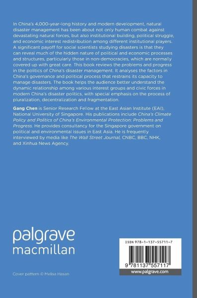 In China's 4,000-year-long history and modern development, natural disaster management has been about not only human combat against devastating natural forces, but also institutional building, political struggle, and economic interest redistribution among different institutional players. A significant payoff for social scientists studying disasters is that they can reveal much of the hidden nature of political and economic processes and structures, particularly those in non-democracies, which are normally covered up with great care. This book reviews the problems and progress in the politics of China's disaster management. It analyses the factors in China's governance and political process that restrains its capacity to manage disasters. The book helps the audience better understand the dynamic relationship among various interest groups and civic forces in modern China's disaster politics, with special emphasis on the process of pluralization, decentralization and fragmentation.