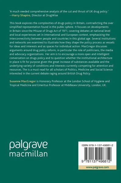 This book explores the complexities of drugs policy in Britain, contradicting the over simplified representation found in the public sphere. It focuses on developments in Britain since the Misuse of Drugs Act of 1971, covering debates at national level and local experiences set in international and European context, emphasizing the interconnectivity between people and countries in this global age. Several institutions and networks are examined to illustrate how they shape the policy process as vessels for ideas and interests and as spaces for individual action. MacGregor discusses arguments around drug policy reform, in particular the role of politicians, the media and advocacy organizations. Her aim is to encourage a more open and intelligent conversation on drugs policy and to question whether the institutional architecture in place is fit for purpose given the great increase of substances available and the underlying variety of conditions and interests currently competing for attention and resources. The is a must read for all scholars of Politics, Medicine and Social Science interested in the current debate raging around British Drug Policy.