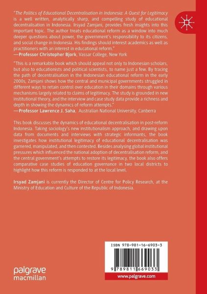 "The Politics of Educational Decentralisation in Indonesia: A Quest for Legitimacy is a well written, analytically sharp, and compelling study of educational decentralisation in Indonesia. Irsyad Zamjani, provides fresh insights into this important topic. The author treats educational reform as a window into much deeper questions about power, the government's responsibility to its citizens, and social change in Indonesia. His findings should interest academics as well as practitioners with an interest in educational reform." -Professor Christopher Bjork, Vassar College, New York