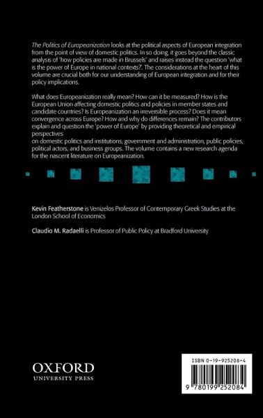 * Theorising Europeanization * 1: Kevin Featherstone: Introduction: In the name of Europe * 2: Claudio M. Radaelli: The Europeanization of public policy * 3: Tanja A. Borzel and Thomas Risse: Conceptualising the domestic impact of Europe * Comparing Institutional Contexts * 4: Hussein Kassim: Meeting the demands of EU membership: The Europeanization of national administrative systems * 5: Mike Goldsmith: Variable geometry, multi-level governance: European integration and sub-national government in the new Millenium * 6: Marco Giuliani: Europeanization in comparative perspective: Institutional fit and national adaptation * Europeanisation and Policy Analysis * 7: Ulrika Morth: Europeanization as interpretation, trnslation, and editing of public policies * 8: Alison J. Harcourt: Europeanization as Convergence: the regulation of media markets in the European Union * 9: Markus Haverland: The impact of the European Union on environmental policies * Interest Groups and Europeanisation * 10: Jurgen R. Grote and A. Lang: Europeanization and organisational change in national trade associations * 11: David Coen and Charles Dannreuther: Differential Europeanization: large and small firms in the EU policy process * Understanding 'Europe' as a Policy Model * 12: Daniel Wincott: The idea of the European social model: Limits and paradoxes of Europeanisation * 13: Heather Grabbe: Europeanisation goes east: power and uncertainty in the EU accession process * Conclusions * 14: Kevin Featherstone and Claudio M. Radaelli: Conclusions: A conversant research agenda