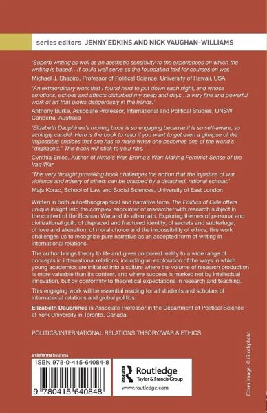 Written in both autoethnographical and narrative form, The Politics of Exile offers unique insight into the complex encounter of researcher with research subject in the context of the Bosnian War and its aftermath. Exploring themes of personal and civilizational guilt, of displaced and fractured identity, of secrets and subterfuge, of love and alienation, of moral choice and the impossibility of ethics, this work challenges us to recognise pure narrative as an accepted form of writing in international relations.