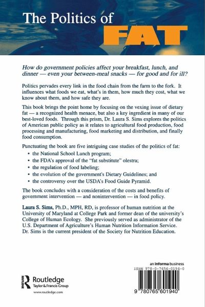 Politics pervades every link in the food chain from the farm to the fork. It influences what foods we eat, how much they cost, what we know about them, and how safe they are. This book brings the point home by focusing on the vexing issue of dietary fat content - known to be a health menace but also an ingredient in many or most of our best-loved foods. Through this prism, Dr. Sims explores the politics of food assistance programmes (with a case study of the National School Lunch programme); agricultural policy (for example, the price premium paid to farmers for milk with high butterfat content); food content (with case studies of food labelling and the approval process for fat substitutes); and dietary change (with a case study of nutrition education programmes). The book concludes with consideration of the costs and benefits of government intervention and nonintervention in food policy from the supply side to the demand side and its consequences for human health (and happiness). "The Politics of Fat" shows how government policy affects not only breakfast, lunch and dinner, but also our between-meal snacks; explores the nexus of health policy and agricultural policy from price supports to trade policy; and is written in an accessible style enlivened by discussion-provoking case studies.
