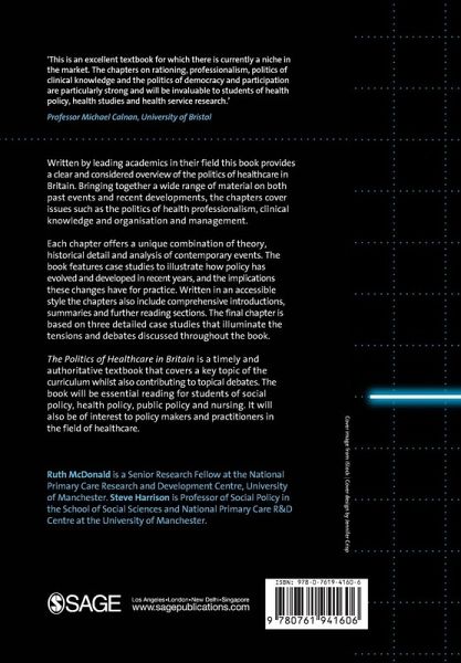 'This is an excellent textbook for which there is currently a niche in the market. The chapters on rationing, professionalism, politics of clinical knowledge and the politics of democracy and participation are particularly strong and will be invaluable to students of health policy, health studies and health service research' - Professor Michael Calnan, University of Bristol Written by leading academics in their field, this book provides a clear and considered overview of the politics of health care in Britain. Bringing together a wide range of material on both past events and recent developments, the chapters cover issues such as the politics of health professionalism, clinical knowledge and organisation and management. Each chapter offers a a unique combination of theory, historical detail and analysis of contemporary events. It features case studies to illustrate how policy has evolved and developed in recent years, and the implications these changes have for practice. Written in an accessible style the chapters also include comprehensive introductions, summaries and further reading sections. The final chapter is based on three detailed case studies that illuminate the tensions and debates discussed throughout the book. The Politics of Healthcare in Britain is a timely and authoritative textbook that covers a key topic of the curriculum whilst also contributing to topical debates. The book will be essential reading for students of social policy, health policy, public policy and nursing. It will also be of interest to policy makers and practitioners in the field of health care.