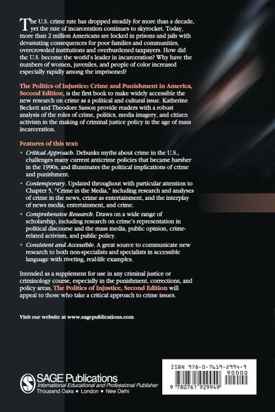 The U.S. crime rate has dropped steadily for more than a decade, yet the rate of incarceration continues to skyrocket. Today, more than 2 million Americans are locked in prisons and jails with devastating consequences for poor families and communities, overcrowded institutions and overburdened taxpayers. How did the U.S. become the world's leader in incarceration? Why have the numbers of women, juveniles, and people of color increased especially rapidly among the imprisoned? The Politics of Injustice: Crime and Punishment in America, Second Edition is the first book to make widely accessible the new research on crime as a political and cultural issue. Katherine Beckett and Theodore Sasson provide readers with a robust analysis of the roles of crime, politics, media imagery and citizen activism in the making of criminal justice policy in the age of mass incarceration.is the first book to make widely accessible the new research on crime as a political and cultural issue. Katherine Beckett and Theodore Sasson provide readers with a robust analysis of the roles of crime, politics, media imagery and citizen activism in the making of criminal justice policy in the age of mass incarceration.