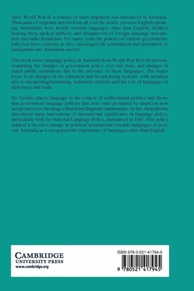 This 1993 book traces language policy in Australia from World War II to the present, examining the changes in government policy over this time, and changes in major public institutions due to the presence of these languages. The major focus is on changes in the education and broadcasting systems, with attention also to interpreting/translating, industrial relations and the role of languages in diplomacy and trade. Dr Ozolins places language in the context of multicultural politics and shows that government language policies that were once prompted by suspicion now accept and even encourage cultural and linguistic maintenance. In fact Australia has introduced many innovations of international significance in language policy, particularly with the National Language Policy, announced in 1987. This policy marked a decisive change in political assumptions towards languages in post-war Australia as it recognised the importance of languages other than English.