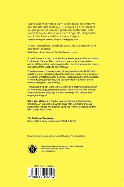 Spanish is now the third most widely spoken language in the world after English and Chinese. This book traces how and why Spanish has arrived at this position, examining its role in the diverse societies where it is spoken from Europe to the Americas. Providing a comprehensive survey of language issues in the Spanish-speaking world, the book outlines the historical roots of the emergence of Spanish or Castilian as the dominant language, analyzes the situation of minority language groups, and traces the role of Spanish and its colonial heritage in Latin America. The book is structured in four sections: Spanish as a national language: conflict and hegemony Legislation and the realities of linguistic diversity Language and education The future of Spanish. Throughout the book Clare Mar-Molinero asks probing questions such as: How does language relate to power? What is its link with identity? What is the role of language in nation-building? Who decides how language is taught?