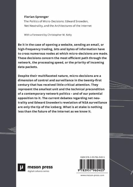Be it in the case of opening a website, sending an email, or high-frequency trading, bits and bytes of information have to cross numerous nodes at which micro-decisions are made. These decisions concern the most efficient path through the network, the processing speed, or the priority of incoming data packets. Despite their multifaceted nature, micro-decisions are a dimension of control and surveillance in the twenty-first century that has received little critical attention. They represent the smallest unit and the technical precondition of a contemporary network politics - and of our potential opposition to it. The current debates regarding net neutrality and Edward Snowden's revelation of NSA surveillance are only the tip of the iceberg. What is at stake is nothing less than the future of the Internet as we know it.