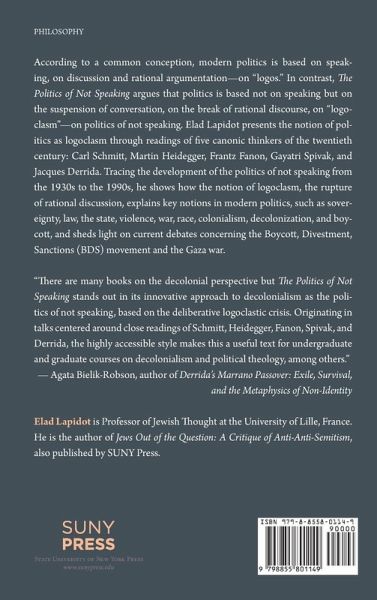 In contrast to the common understanding of politics as a domain of speaking, reveals an alternative tradition where the spoken word fails, collapses, breaks (i.e., a politics of not speaking). According to a common conception, modern politics is based on speaking, on discussion and rational argumentation-on "logos." In contrast, The Politics of Not Speaking argues that politics is based not on speaking but on the suspension of conversation, on the break of rational discourse, on "logoclasm"-on politics of not speaking. Elad Lapidot presents the notion of politics as logoclasm through readings of five canonic thinkers of the twentieth century: Carl Schmitt, Martin Heidegger, Frantz Fanon, Gayatri Spivak, and Jacques Derrida. Tracing the development of the politics of not speaking from the 1930s to the 1990s, he shows how the notion of logoclasm, the rupture of rational discussion, explains key notions in modern politics, such as sovereignty, law, the state, violence, war, race, colonialism, decolonization, and boycott, and sheds light on current debates concerning the Boycott, Divestment, Sanctions (BDS) movement and the Gaza war.