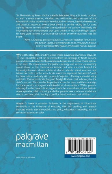 "In The Politics of Parent Choice in Public Education, Wayne D. Lewis provides us with a comprehensive, detailed and well researched treatment of the educational choice movement in America. Rich with facts, historical references, and practical anecdotes, Lewis's book should be on the reading list for every aspiring teacher in every teacher training school in the country. This timely and informative book demonstrates that Lewis will be an education thought leader for many years to come. If you care about our kids and their education, read this book!" - Kevin P. Chavous, Executive Counsel, American Federation for Children and author, Voices of Determination and Serving Our Children: Charter Schools and the Reform of American Public Education