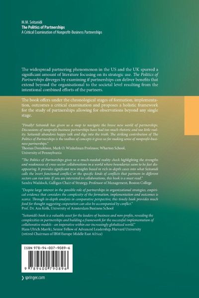 "Based on an extensive literature study of partnerships, she particularly analyses partnerships between nonprofit organisations (NPOs) and businesses (BUSs) ... . The rich in-depth case studies, well-framed in the strands of literature on partnerships, combined with the proposition of a holistic framework, reveal a lot of the complexities of partnerships. The book provides much food for thought on businesses improving their corporate social responsibility through cooperation with nongovernmental organistions and the organisational consequences for the partners." (Pieter Glasbergen, Journal of Integrative Environmental Sciences, Vol. 8 (2), June, 2011)