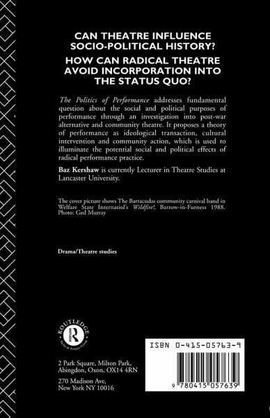The Politics of Performance^ addresses fundamental questions about the social and political purposes of performance through an investigation into post-war alternative and community theatre. It proposes a theory of performace as ideological transaction, cultural intervention and community action, which is used to illuminate the potential social and political effects of radical performance practice. It raises issues about the nature of alternative theatre as a movement and the aesthetics of its styles of production, especially in relation to progressive counter-cultural formations. It analyses in detail the work of key practitioners in socially engaged theatre during four decades, setting each in the context of social, political and cultural history and focusing particularly on how they used that context to enhance the potential efficacy of their productions. The book is thus a detailed analysis of oppositional theatre as radical cultural practice in its various efforts to subvert the status quo. Its purpose is to raise the profile of these approaches to performance by proposing, and demonstrating how they may have had a significant impact on social and political history.