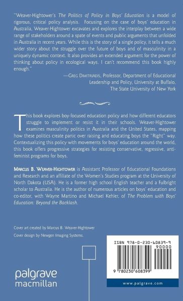"Weaver-Hightower s The Politics of Policy in Boys' Education is a model of rigorous, critical policy analysis. Focusing on the case of boys education in Australia, Weaver-Hightower excavates and explores the interplay between a wide range of stakeholders around a spate of events and public arguments that unfolded in Australia in recent years. While this is the story of a single policy, it tells a much wider story about the struggle over the future of boys and of masculinity in a uniquely dynamic context. It also provides an extended argument for the power of thinking about policy in ecological ways. I can t recommend this book highly enough." - Greg Dimitriadis, Professor, Department of Educational Leadership and Policy, University at Buffalo, The State University of New York