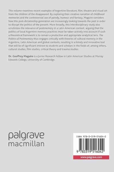 This volume examines recent examples of Argentine literature, film, theatre and visual art from the children of the disappeared. By exploring their creative narration of childhood memories and the controversial use of parody, humour and fantasy, Maguire considers how this post-dictatorship generation are increasingly looking towards the past in order to disrupt the politics of the present. More broadly, this interdisciplinary study also scrutinizes the relevance of postmemory in a Latin American context, arguing that the politics of local Argentine memory practices must be taken actively into account if such a theoretical framework is to remain a productive and appropriate analytical lens. The Politics of Postmemory thus engages critically with theories of cultural memory in the Argentine, Latin American and global contexts, resulting in a timely and innovative text that will be of significant interest to students and scholars in the fields of, among others, cultural studies, film studies, critical theory and trauma studies.