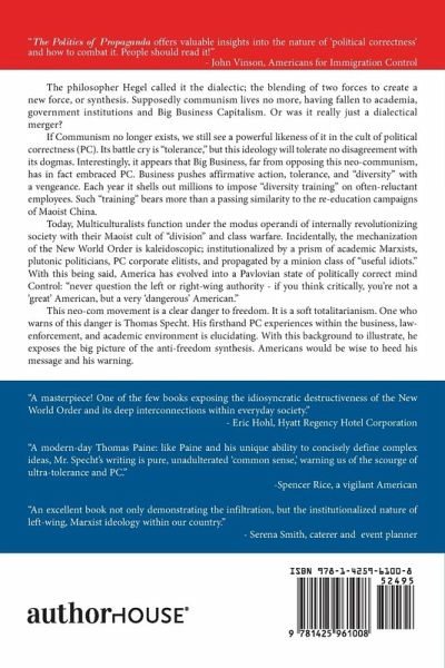 The philosopher Hegel called it the dialectic; the blending of two forces to create a new force, or synthesis. Supposedly communism lives no more, having fallen to academia, government institutions and Big Business Capitalism. Or was it really just a dialectical merger? If Communism no longer exists, we still see a powerful likeness of it in the cult of political correctness (PC). Its battle cry is "tolerance," but this ideology will tolerate no disagreement with its dogmas. Interestingly, it appears that Big Business, far from opposing this neo-communism, has in fact embraced PC. Business pushes affirmative action, tolerance, and "diversity" with a vengeance. Each year it shells out millions to impose "diversity training" on often-reluctant employees. Such "training" bears more than a passing similarity to the re-education campaigns of Maoist China. Today, Multiculturalists function under the modus operandi of internally revolutionizing society with their Maoist cult of "division" and class warfare. Incidentally, the mechanization of the New World Order is kaleidoscopic; institutionalized by a prism of academic Marxists, plutonic politicians, PC corporate elitists, and propagated by a minion class of "useful idiots." With this being said, America has evolved into a Pavlovian state of politically correct mind Control: "never question the left or right-wing authority - if you think critically, you're not a 'great' American, but a very 'dangerous' American." This neo-com movement is a clear danger to freedom. It is a soft totalitarianism. One who warns of this danger is Thomas Specht. His firsthand PC experiences within the business, law-enforcement, and academic environment is elucidating. With this background to illustrate, he exposes the big picture of the anti-freedom synthesis. Americans would be wise to heed his message and his warning.