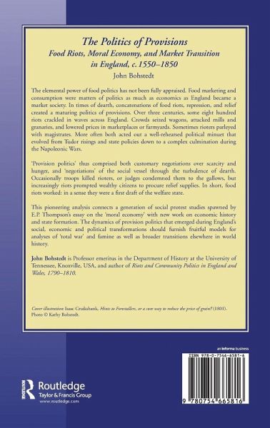 The elemental power of food politics has not been fully appraised. Food marketing and consumption were matters of politics as much as economics as England became a market society. In times of dearth, concatenations of food riots, repression, and relief created a maturing politics of provisions. Over three centuries, some eight hundred riots crackled in waves across England. Crowds seized wagons, attacked mills and granaries, and lowered prices in marketplaces or farmyards. Sometimes rioters parleyed with magistrates. More often both acted out a well-rehearsed political minuet that evolved from Tudor risings and state policies down to a complex culmination during the Napoleonic Wars. 'Provision politics' thus comprised both customary negotiations over scarcity and hunger, and 'negotiations' of the social vessel through the turbulence of dearth. Occasionally troops killed rioters, or judges condemned them to the gallows, but increasingly riots prompted wealthy citizens to procure relief supplies. In short, food riots worked: in a sense they were a first draft of the welfare state. This pioneering analysis connects a generation of social protest studies spawned by E.P. Thompson's essay on the 'moral economy' with new work on economic history and state formation. The dynamics of provision politics that emerged during England's social, economic and political transformations should furnish fruitful models for analyses of 'total war' and famine as well as broader transitions elsewhere in world history.