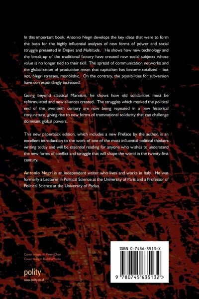 In this important book, Antonio Negri develops the key ideas that were to form the basis for the highly influential analyses of new forms of power and social struggle presented in Empire and Multitude. He shows how new technology and the break-up of the traditional factory have created new social subjects whose value is no longer tied to their skill. The spread of communication networks and the globalization of production mean that capitalism has become totalized - but not, Negri stresses, monolithic. On the contrary, the possibilities for subversion have correspondingly increased. Going beyond classical Marxism, he shows how old solidarities must be reformulated and new alliances created. The struggles which marked the political end of the twentieth century are now being repeated in a new historical conjuncture, giving rise to new forms of transnational solidarity that can challenge dominant global powers. This new paperback edition, which includes a new Preface by the author, is an excellent introduction to the work of one of the most influential political thinkers writing today and will be essential reading for anyone who wishes to understand the new forms of conflict and struggle that will shape the world in the twenty-first century.