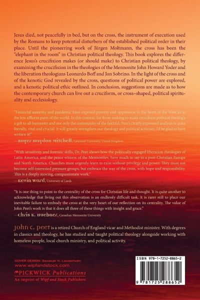 Jesus died, not peacefully in bed, but on the cross, the instrument of execution used by the Romans to keep potential disturbers of the established political order in their place. Until the pioneering work of Jurgen Moltmann, the cross has been the "elephant in the room" in Christian political theology. This book explores the difference Jesus's crucifixion makes (or should make) to Christian political theology, by examining the crucifixion in the theologies of the Mennonite John Howard Yoder and the liberation theologians Leonardo Boff and Jon Sobrino. In the light of the cross and of the kenotic God revealed by the cross, questions of political power are explored, and a kenotic political ethic outlined. In conclusion, suggestions are made as to how the contemporary church can live out a cruciform, or cross-shaped, political spirituality and ecclesiology.