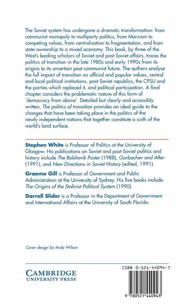 This book, written by three of the West's leading scholars of Soviet and post-Soviet affairs, traces the politics of Soviet transition in the late 1980s and early 1990s from its origins to its uncertain post-communist future. It provides an ideal guide for students and specialists to the changes from a communist to a post-communist world.