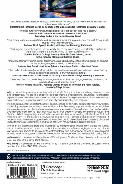 The book argues that uncertainties must be understood as complex constructions of knowledge, materiality, experience, embodiment and practice. Examining in particular how uncertainties are experienced in contexts of marginalisation and precarity, this book shows how sustainability and development are not just technical issues, but depend deeply on political values and choices. What burgeoning uncertainties require lies less in escalating efforts at control, but more in a new - more collective, mutualistic and convivial - politics of responsibility and care. If hopes of much-needed progressive transformation are to be realised, then currently blinkered understandings of uncertainty need to be met with renewed democratic struggle.