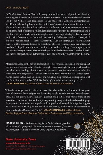 In The Politics of Vibration Marcus Boon explores music as a material practice of vibration. Focusing on the work of three contemporary musicians-Hindustani classical vocalist Pandit Pran Nath, Swedish drone composer and philosopher Catherine Christer Hennix, and Houston-based hip-hop musician DJ Screw-Boon outlines how music constructs a vibrational space of individual and collective transformation. Contributing to a new interdisciplinary field of vibration studies, he understands vibration as a mathematical and a physical concept, as a religious or ontological force, and as a psychological determinant of subjectivity. Boon contends that music, as a shaping of vibration, needs to be recognized as a cosmopolitical practice-in the sense introduced by Isabelle Stengers-in which what music is within a society depends on what kinds of access to vibration are permitted, and to whom. This politics of vibration constitutes the hidden ontology of contemporary music because the organization of vibration shapes individual music scenes as well as the ethical choices that participants in these scenes make about how they want to live in the world.