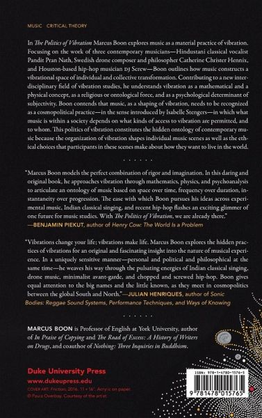 In The Politics of Vibration Marcus Boon explores music as a material practice of vibration. Focusing on the work of three contemporary musicians-Hindustani classical vocalist Pandit Pran Nath, Swedish drone composer and philosopher Catherine Christer Hennix, and Houston-based hip-hop musician DJ Screw-Boon outlines how music constructs a vibrational space of individual and collective transformation. Contributing to a new interdisciplinary field of vibration studies, he understands vibration as a mathematical and a physical concept, as a religious or ontological force, and as a psychological determinant of subjectivity. Boon contends that music, as a shaping of vibration, needs to be recognized as a cosmopolitical practice-in the sense introduced by Isabelle Stengers-in which what music is within a society depends on what kinds of access to vibration are permitted, and to whom. This politics of vibration constitutes the hidden ontology of contemporary music because the organization of vibration shapes individual music scenes as well as the ethical choices that participants in these scenes make about how they want to live in the world.