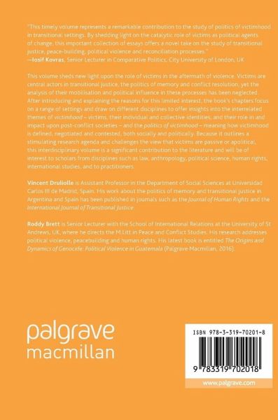 Chapter 1. Introduction. Understanding the construction of victimhood and the evolving role of victims in transitional justice and peacebuilding; Vincent Druliolle and Roddy Brett.- Part I: Defining victims and victimhood.- Chapter 2. Victims and victimhood in reparation programs: Lessons from Latin America; Jemima García-Godos.- Chapter 3. Franco's victims in Spain: The long road towards justice and recognition; Rosa Ana Alija-Fernández and Olga Martín-Ortega.- Chapter 4. The struggle for recognition of the stolen children and the politics of victimhood in Spain; Vincent Druliolle.- Chapter 5. What defines the victims of human rights violations? The case of the Comité Pro Paz and Vicaría de la Solidaridad in Chile (1973-1992); Oriana Bernasconi, Marcela Ruiz and Elizabeth Lira.- Chapter 6. The politics of victimhood at the grassroots level: Inclusion and exclusion among Peruvian victim organisations; Mijke de Waardt.- Part II: Victims in the political arena.- Chapter 7. Explaining compensation in post-war Bosnia and Herzegovina: The case of victims of torture and sexual violence; Jessie Hronesová.- Chapter 8. Uncooked rice: Justice and victimhood at the Extraordinary Chambers in the Courts of Cambodia and beyond; Johanna Herman.- Chapter 9. The uses of suffering: Victims as moral beacons or icons of grievance; Marie Breen-Smyth.- Chapter 10. Reconciliation in the making: Overcoming competitive victimhood through inter-group dialogue in Palestine/Israel; Olga Burkhardt-Vetter.- Part III: Victims, democratisation and peace processes.- Chapter 11. The role of the victims' delegations in the Santos-FARC peace talks; Roddy Brett.- Chapter 12. Victims and survivors from Cyangugu, Rwanda: The politics of testimony after genocide; Rachel Ibreck.