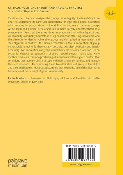 This book describes and analyzes the conceptual ambiguity of vulnerability, in an effort to understand its particular applications for legal and political protection when relating to groups. Group vulnerability has become a common concept within legal and political scholarship but remains largely undertheorized as a phenomenon itself. At the same time, in academia and within legal circles, vulnerability is primarily understood as a phenomenon affecting individuals, and the attempts to identify vulnerable groups are discredited as essentialist and stereotypical. In contrast, this book demonstrates that a conception of group vulnerability is not only theoretically possible, but also politically and legally necessary. Two conceptions of group vulnerability are discussed: one focuses on systemic violence or oppression directed toward several individuals, while another requires a common positioning of individuals within a given context that conditions their agency, ability to copewith risks and uncertainties, and manage their consequences. By comparing these two definitions of group vulnerability and their implications, Macioce seeks a more precise delineation of the theoretical boundaries of the concept of group vulnerability.