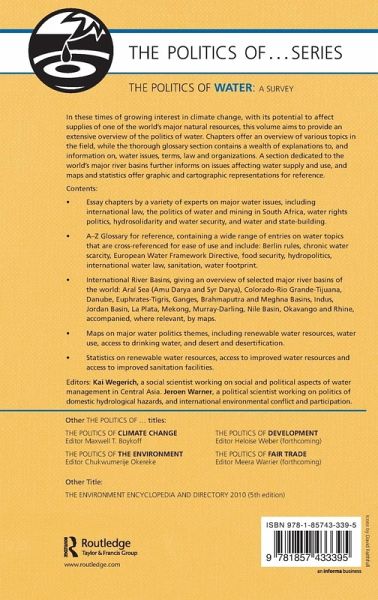 This new title presents timely information covering the global politics of water. With the current threat of climate change and the increasing demand on water resources, this title gives an invaluable insight into an increasingly politicized topic. Includes: * in-depth essays on major topics in water politics * an A-Z glossary of key terms, issues, organizations, etc. in water politics * a section of information on selected major river basins of the world, including maps where appropriate * maps detailing water consumption and resources * statistical tables. The Politics of Water provides an invaluable guide to politics surrounding the availability and provision of water on a world-wide scale and is the only guide to deal with the issues of water in politics in such detail. It is an invaluable reference source for anyone who is interested in, or studying the politics of water, or indeed climate change.