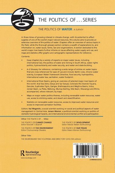 This authoritative reference work gives timely information on the global politics of water. Readers will find case studies on a variety of complex water situations, from the Okavango River that flows through Angola, Namibia and Botswana, to the Euphrates-Tigris of the Upper Persian Gulf. With the current threat of climate change and increasing demand on water resources, the book gives valuable insight into an increasingly politicized topic. Politics of Water is a welcome addition to Routledge's extensive The Politics of ... reference series. Readers will benefit from: essays on major topics in water politics from a variety of contributors (thirteen in all), including Is water politics? Towards international water relations and The politics of water and mining in South Africa sensitive debate on gender issues, reflecting the fact that in many cultures men are responsible for the supply of water, and women as cultivators and house keepers are the major users an A-Z glossary of key terms, issues, organizations, etc. in water politics information on selected major river basins of the world, including maps detailing water consumption and resources. The Politics of Water is a useful guide to the politics surrounding the availability and provision of water on a world-wide scale. It will prove to be a useful reference source for anyone interested in, or studying, the politics of water and climate change.