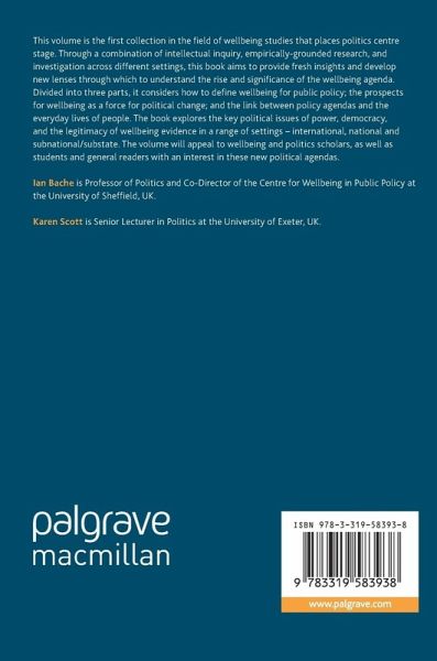 Introduction.- 1: Wellbeing in politics and policy - Ian Bache and Karen Scott.- Part One - Political theory and wellbeing.- 2: The End of History and the Invention of Happiness; Jules Evans.- 3: Well-being and Social Justice: In Defence of the Capabilities Approach; Annie Austin.- 4: The Proper Role for Wellbeing in Public Policy: towards a Pluralist, Pragmatic, Theory-neutral Approach; Tim Taylor.- Part Two - Wellbeing: a force for political change?.- 5: Is wellbeing a useful concept for progressives?; Charles Seaford.- 6: Between Policies and Life: The Political Process of Buen Vivir in Ecuador; Daniela Bressa Florentin.- 7: Challenging the dominant economic narrative through alternative wellbeing indicators: the Canadian experience; Anders Hayden and Jeff Wilson.- 8: Societal Wellbeing - Catalyst for Systems and Social Change in Northern Ireland?; Peter Doran and Susan Hodgett.- Part Three - Between wellbeing policy and everyday lives: critical perspectives.- 9: Reconciling Universal Frameworks and Local Realities in Understanding and Measuring Wellbeing; Allister McGregor.- 10: 'Therapeutic entrepreneurialism' and the undermining of expertise and evidence in the education politics of wellbeing; Kathryn Ecclestone.- 11: Skivers, Strivers and Thrivers: The shift from welfare to wellbeing in New Zealand and the United Kingdom; Karen Scott and Annick Masselot.- 12:The politics of the official statistic: the UK 'Measuring National Well-being' programme; Matt Jenkins.-