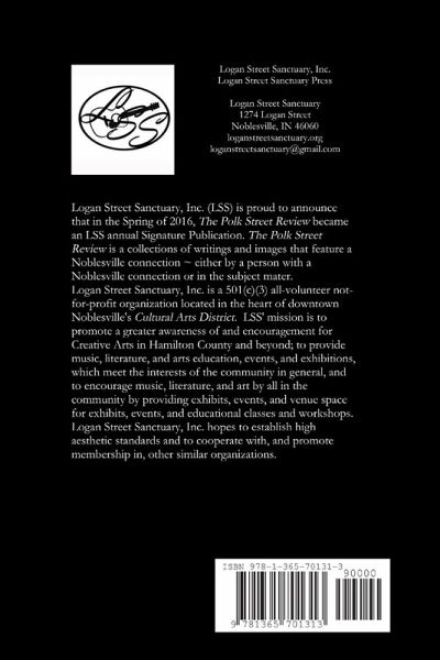 The Polk Street Review is published annually by Community Education Arts, Inc. (formerly known as Logan Street Sanctuary, Inc), a 501c3 nonprofit Arts organization. Logan Street Sanctuary, Inc. (LSS) is proud to announce that in the Spring of 2016, The Polk Street Review became an LSS annual Signature Publication. The Polk Street Review is a collection of memoirs, poetry, song lyrics, fiction, nonfiction, and images with a connection to Noblesville ~ each piece is either by someone with a Noblesville connection or the content/subject matter has a Noblesville connection. The popular book launch is also now one of LSS's annual Signature Events, and our first official The Polk Street Review book launch celebration was held on February 25, 2017, with prizes for Merit Award (Best in Book), and 1st Place, 2nd Place, 3rd Place, and (3) Honorable Mentions in three categories (Prose, Poetry and Song Lyrics, and Images).