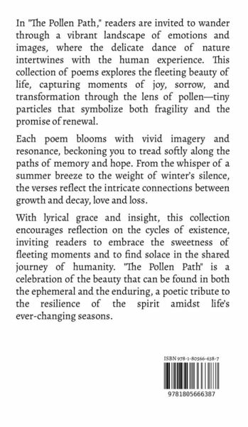 In "The Pollen Path," readers are invited to wander through a vibrant landscape of emotions and images, where the delicate dance of nature intertwines with the human experience. This collection of poems explores the fleeting beauty of life, capturing moments of joy, sorrow, and transformation through the lens of pollen-tiny particles that symbolize both fragility and the promise of renewal. Each poem blooms with vivid imagery and resonance, beckoning you to tread softly along the paths of memory and hope. From the whisper of a summer breeze to the weight of winter's silence, the verses reflect the intricate connections between growth and decay, love and loss. With lyrical grace and insight, this collection encourages reflection on the cycles of existence, inviting readers to embrace the sweetness of fleeting moments and to find solace in the shared journey of humanity. "The Pollen Path" is a celebration of the beauty that can be found in both the ephemeral and the enduring, a poetic tribute to the resilience of the spirit amidst life's ever-changing seasons.